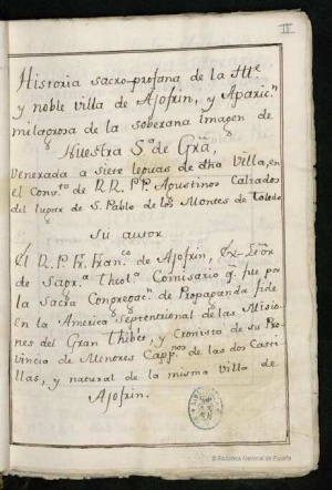 Francisco de Ajofrín, s. XVIII. Historia sacro-profana de la ilustre y noble villa de Ajofrín, y aparición milagrosa de la imagen de Nuestra Señora de Gracia, venerada a siete leguas de dicha villa, en el Convento de Reverendos Padres Agustinos Calzados del lugar de San Pablo de los montes de Toledo, Madrid, BNE, MSS/2169, vol. 1. (Fuente: Biblioteca Digital Hispánica. Imagen procedente de los fondos de la Biblioteca Nacional de España).