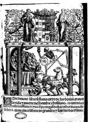 Francesc Eiximenis, 1542. Este devoto libro se llama carro de las donas. Trata de la vida y muerte del hombre christiano. Es intitulado a la christianíssima reyna de Portugal doña Catherina, nuestra señora. Tiene cinco libros de grandes y sanctas doctrinas, Valladolid: por industria de Juan de Villaquirán. (Fuente: Universitat de València. Biblioteca Histórica: BH Z-05/061).