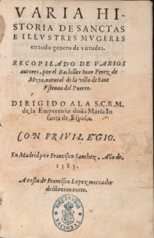 (Página creada con «Archivo:Portada varia historia de sanctas e ilustres mujeres Juan Pérez de Moya.jpg|miniatura|300px|right|Juan Pérez de Moya, 1583. ''Varia historia de sanctas e illust...») |